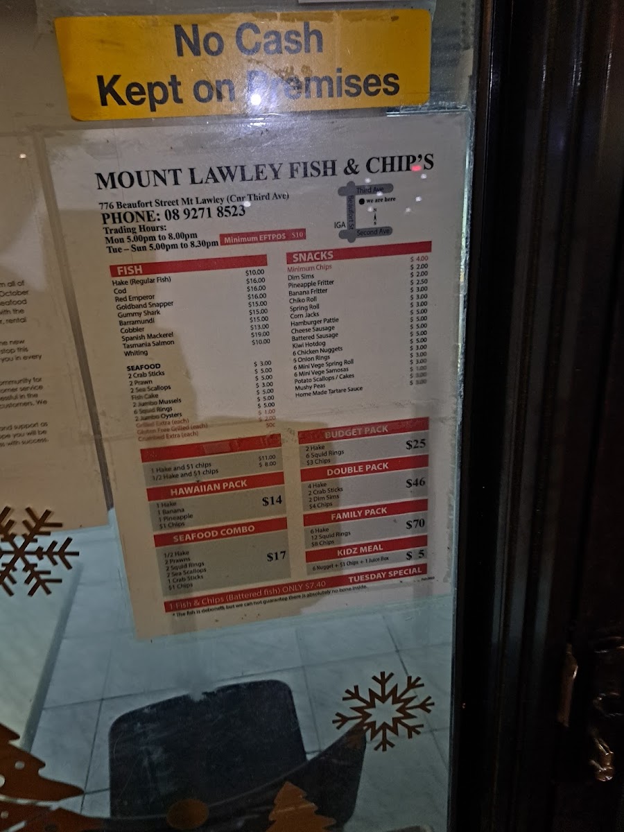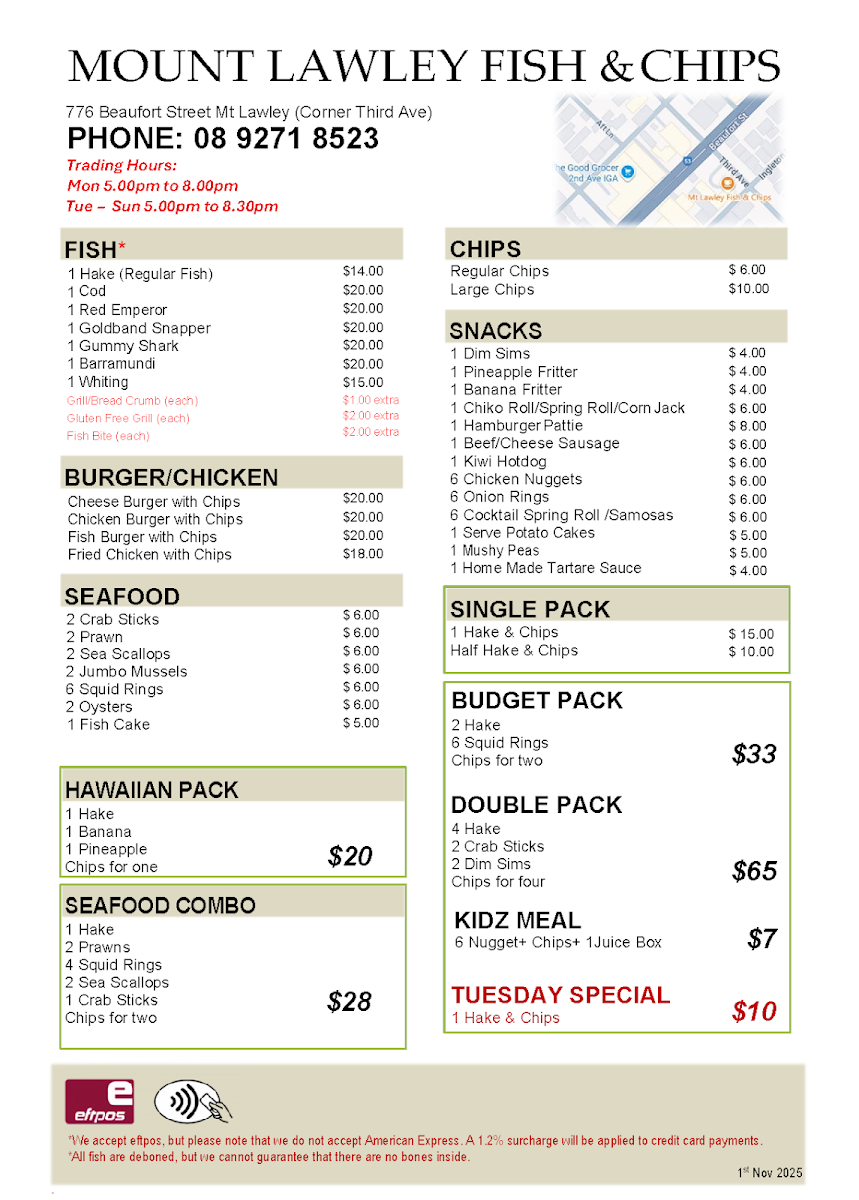 The menu at Mount Lawley Fish & Chips offers a straightforward, casual selection that fits perfectly with the relaxed, no-fuss atmosphere of this local favourite. It’s a place where simple, comforting meals come together, making it easy to enjoy a satisfying bite whether you’re grabbing a quick takeout or settling in for a casual dinner.